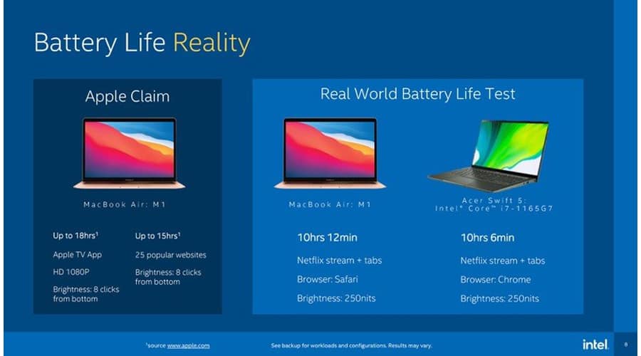 Intel ได้ทำการทดสอบอายุการใช้งานแบตเตอรี่ พบว่าทั้ง MacBook Air ชิป M1 และ Acer Swift 5 ที่ใช้โปรเซสเซอร์ Intel Core i7 Gen 11th มีอายุการใช้งานแบตเตอรี่ 10 ชั่วโมงเท่ากัน เมื่อทดสอบโดยการสตรีม Netflix โดยการเปิดแท็บเพิ่มเติม และทั้ง 2 เครื่องถูกตั้งค่าความสว่างของจอไว้ที่ 250 nits โดย MacBook Air ใช้เบราเซอร์ Safari และ Acer Swift 5 ใช้เบราเซอร์ Chrome ในการทดสอบ