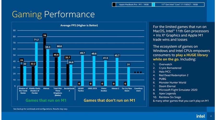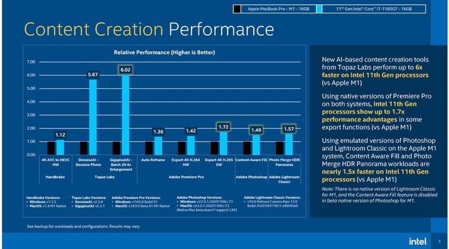 PCWorld แชร์สไลด์ของทาง Intel เน้นย้ำข้อมูลการทดสอบบ benchmark เปรียบเทียบแล็ปท็อปที่ใช้โปรเซสเซอร์ Intel Gen 11th Tiger Lake ประสิทธิภาพเหนือกว่า Mac ที่ใช้ชิป M1 ของ Apple