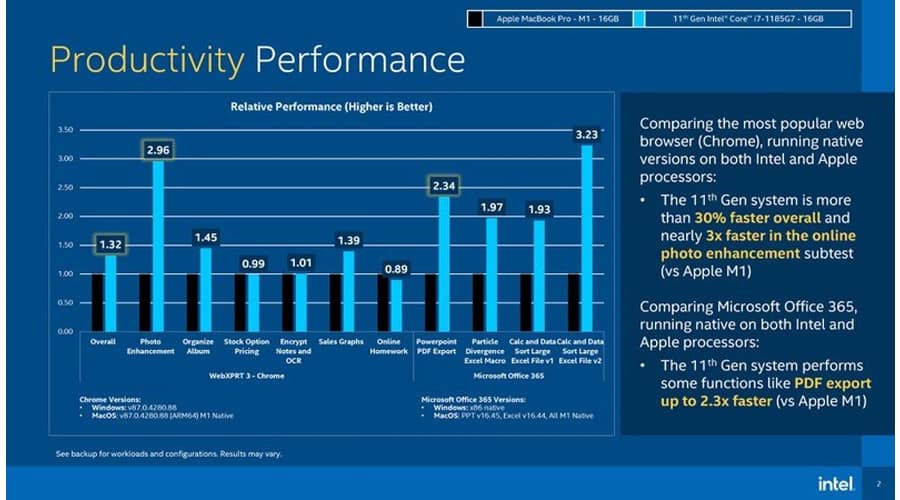 Intel กล่าวว่าการ export ข้อมูล PowerPoint ให้เป็นไฟล์ PDF นั้น เร็วขึ้นถึง 2.3 เท่าบนแล็ปท็อปที่ใช้ระบบปฏิบัติการ Windows ที่ติดตั้งด้วยโปรเซสเซอร์ Intel Core i7 Gen 11th และ RAM 16GB เมื่อเทียบกับการทำงานเดียวกันบน MacBook Pro 13 นิ้วที่ใช้งานชิปM1 และ RAM 16GB