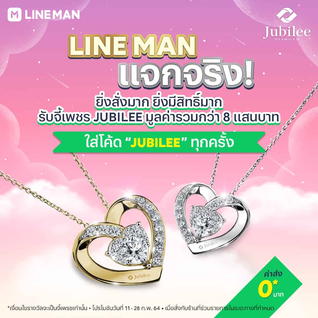 แต่ความพิเศษในเดือนแห่งความรักยังไม่หมดเพียงเท่านี้ เพราะ LINE MAN ได้จับมือกับ Jubilee มอบสิทธิ์ลุ้นจี้เพชรแท้ถึง 36 รางวัล (จังหวัดละ 1 รางวัล) มูลค่ารวมกว่า 800,000 บาท สำหรับผู้ที่มียอดรวม การสั่งอาหารมูลค่าสูงสุดใน 36 จังหวัดของพื้นที่ให้บริการ LINE MAN และใส่โค้ด “JUBILEE” ทุกครั้งที่สั่ง มีสิทธิ์รับ จี้เพชรจาก Jubilee มูลค่า 23,500 บาท ตั้งแต่วันที่ 11 – 28 กุมภาพันธ์นี้เช่นเดียวกัน