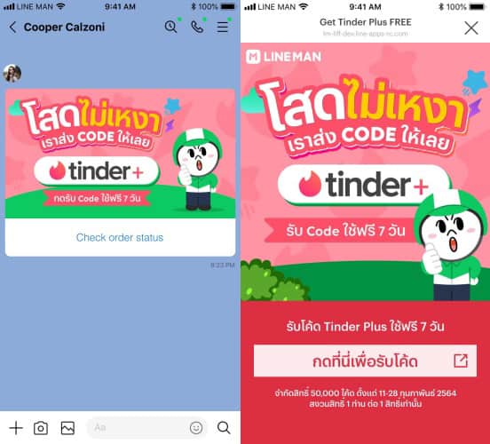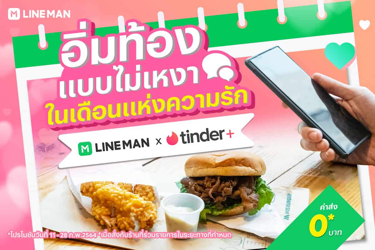 - ส่วนใครที่กำลังมองหาคนพิเศษให้มานั่งกินมื้ออร่อยด้วยกัน สั่งเมนูโปรดจาก LINE MAN เสร็จแล้ว เลือกชื่อเพื่อนในแอปฯ LINE เพื่อส่ง “Tinder Valentine’s Card” ที่ซ่อนเซอร์ไพรส์ด้วยสิทธิ์รับโค้ด Tinder Plus ใช้งานได้ฟรี 7 วันสำหรับคนที่สั่งอาหารและเพื่อนที่รับอาหาร (รับสิทธิ์ได้ 1 ครั้งต่อผู้ใช้เท่านั้น) ทำให้เราสามารถปัดไลก์ได้ไม่จำกัดและยังมีพาสปอร์ตให้ไปหาเพื่อนกินข้าวจากระยะไกลได้อีกต่างหาก