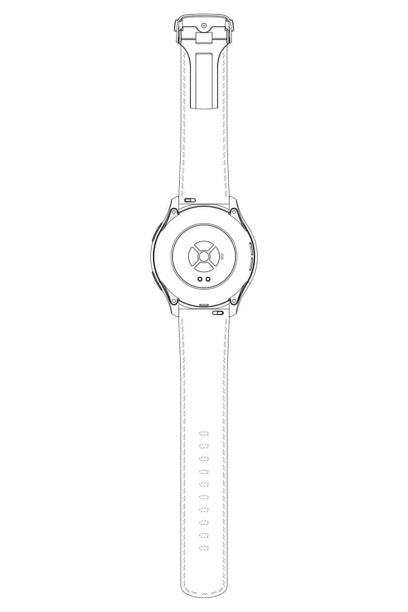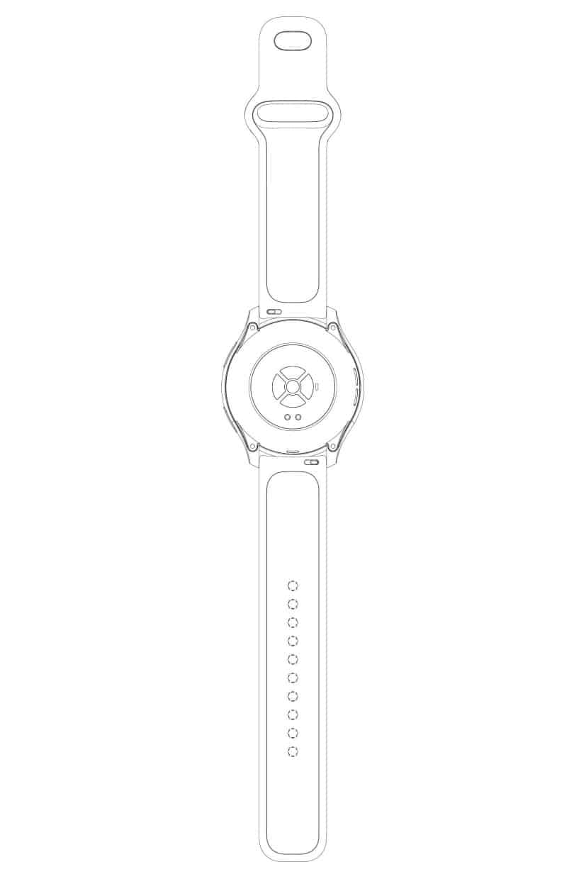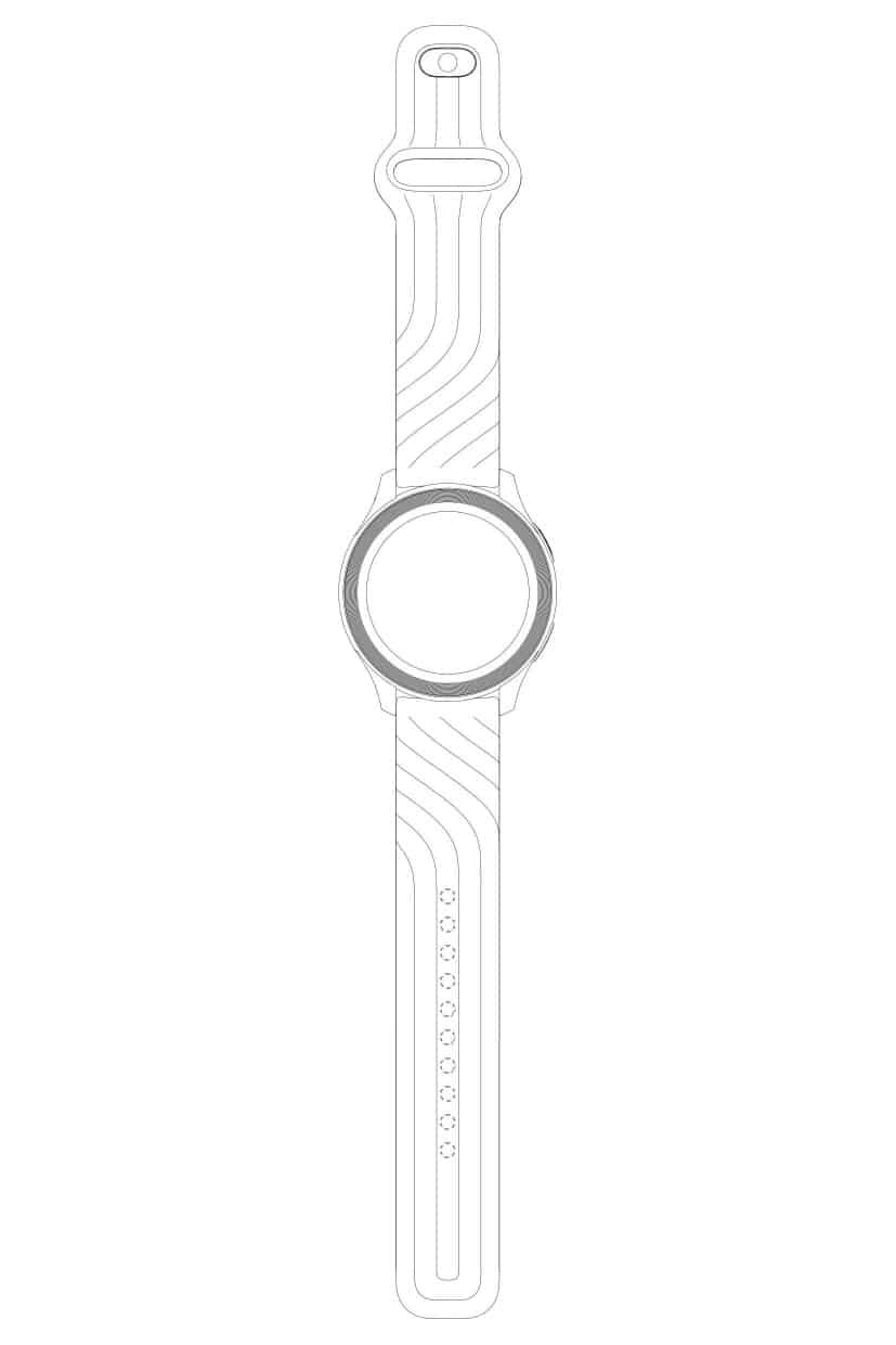 ภาพสิทธิบัตรแรกคาดว่าจะเป็นรุ่นสปอร์ต มาพร้อมสายรัดที่หน้าตาดูคล้ายกับสายรัดบนสมาร์ทวอทช์ทั่วไป และยังมีลักษณะคล้ายกับสายแบบ Sport Band ของ Apple Watch ด้วย ทำให้เราเดาว่ามันน่าจะทำจากซิลิโคน