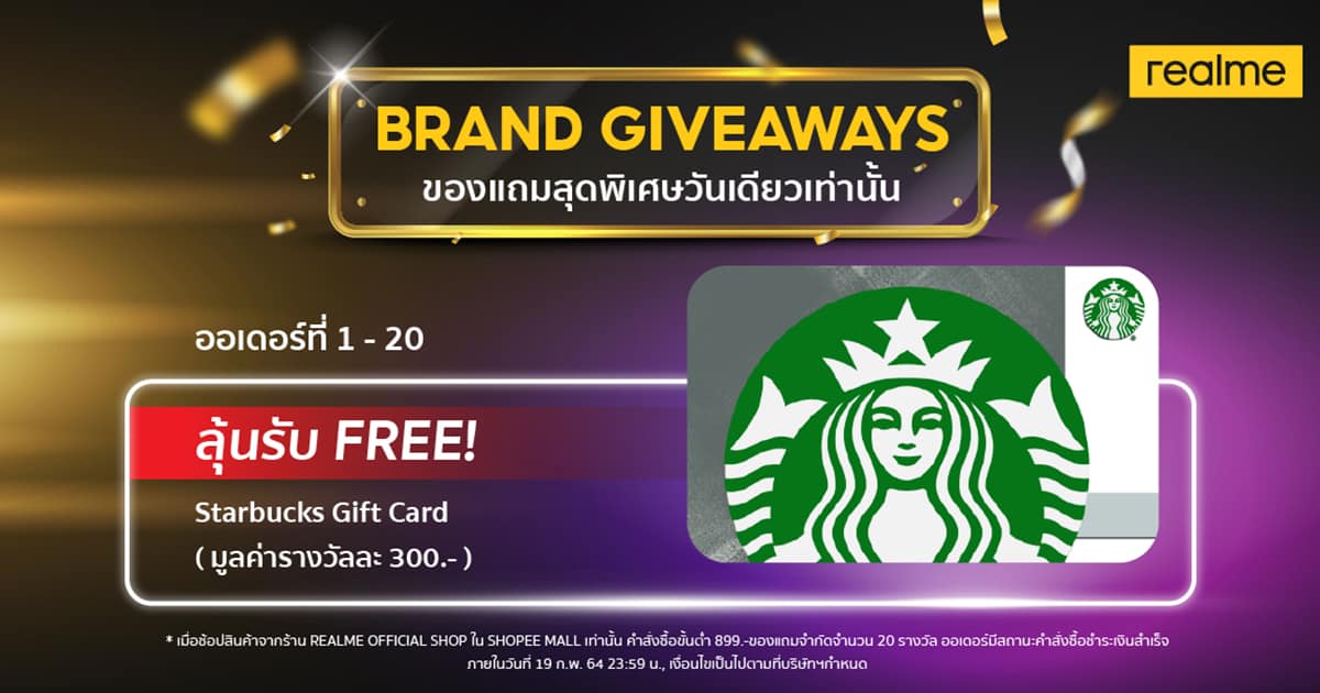 สำหรับออเดอร์ที่ 1 – 20 เมื่อสั่งซื้อขั้นต่ำ 899 บาท ลุ้นรับฟรี Starbuck Gift Card มูลค่า 300 บาท