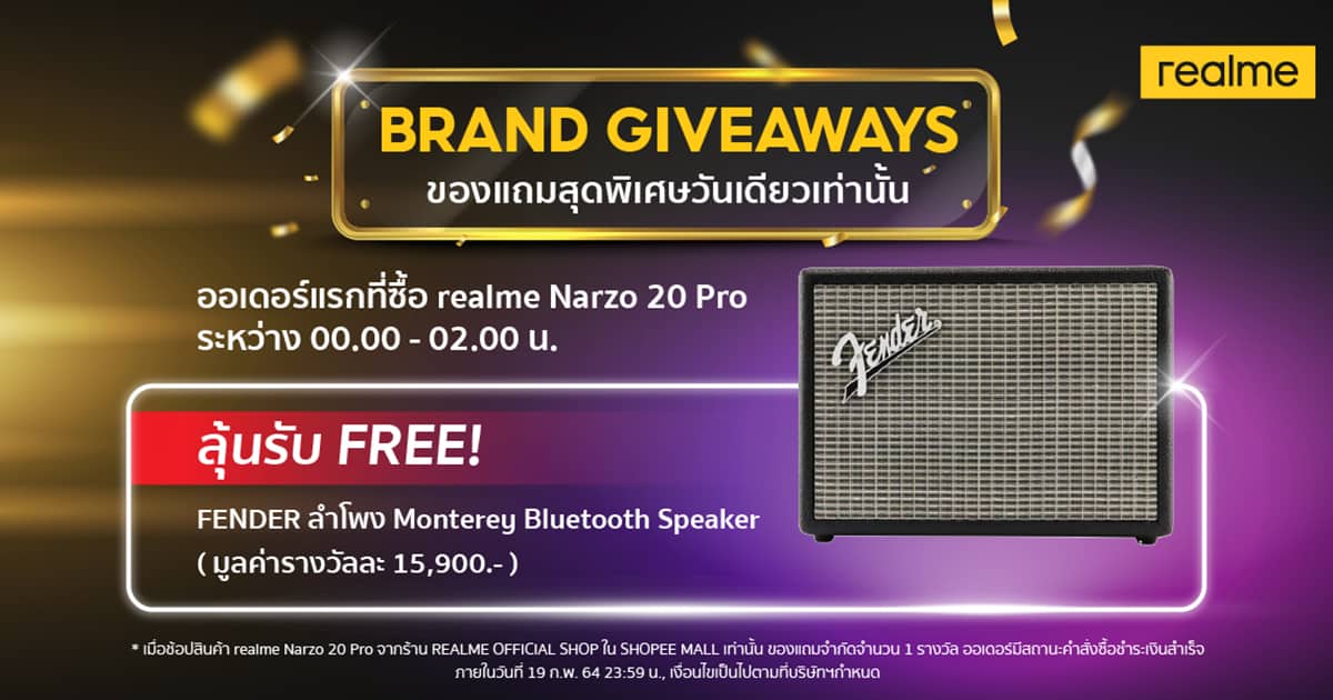 สำหรับออเดอร์แรกที่ซื้อ realme narzo 20 Pro ระหว่าง 00:00 – 02:00 น. ลุ้นรับฟรี FENDER ลำโพง Monterey Bluetooth Speaker มูลค่า 15,900 บาท