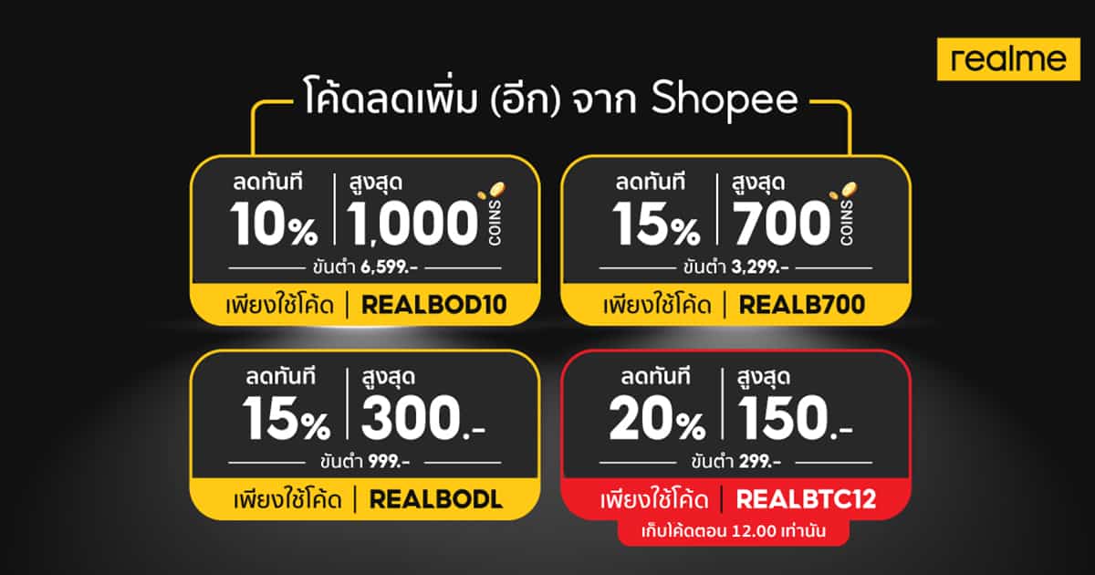 realme ร่วมมือกับ Shopee จัดแคมเปญ Brand of the day ‘realme Smart Carnival’ มอบส่วนลดสูงสุด 50% พร้อมแจกโค้ดส่วนลดตลอดทั้งวัน ทั้ง Exclusive Vouchers ลดสูงสุด 800 บาท Special Flash Voucher ลดสูงสุด 1,000 บาท และโค้ดลดเพิ่มจาก Shopee สูงสุด 20% รับเงินคืนสูงสุด 1,000 coin นอกจากนี้ ยังพบกับ Flash sale สมาร์ทโฟนและผลิตภัณฑ์ AIoT ใหม่ล่าสุดตลอดทั้งวัน จัดหนักจัดเต็มกับของแถมสุดพิเศษ เฉพาะวันที่ 19 กุมภาพันธ์นี้ ผ่านทาง Shopee เท่านั้น