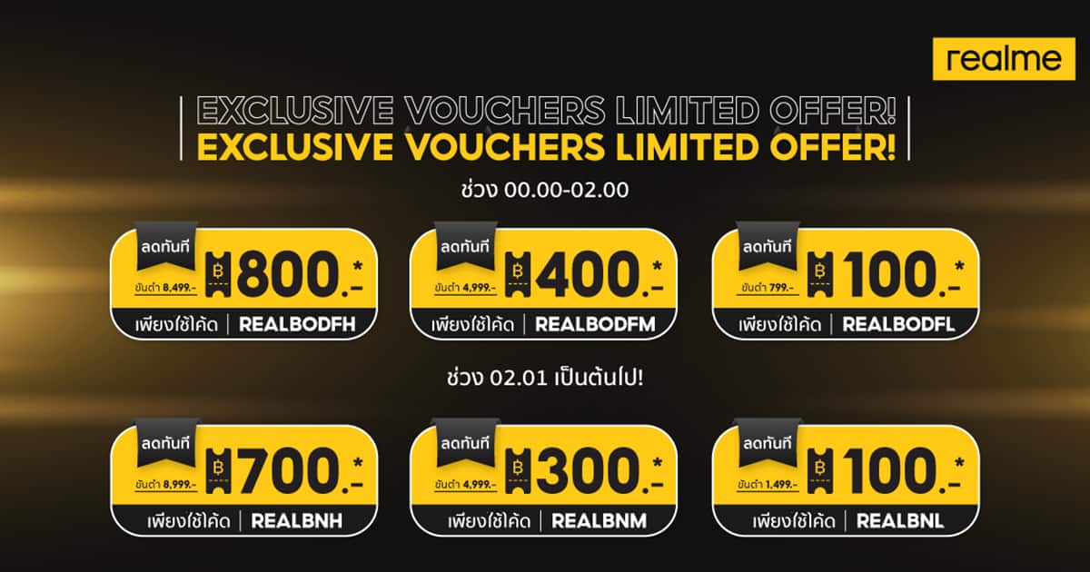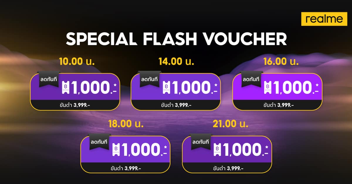 นอกจากนี้ realme ยังแจก Special Flash Voucher โค้ดจัดเต็ม 5 ช่วงเวลาทั้งวัน ดังนี้ เวลา 10:00 น./ 14:00 น./ 16:00 น./ 18:00 น. และ 21:00 น. พบกับโค้ดลดทันที 1,000 บาท เมื่อซื้อขั้นต่ำ 3,999 บาท