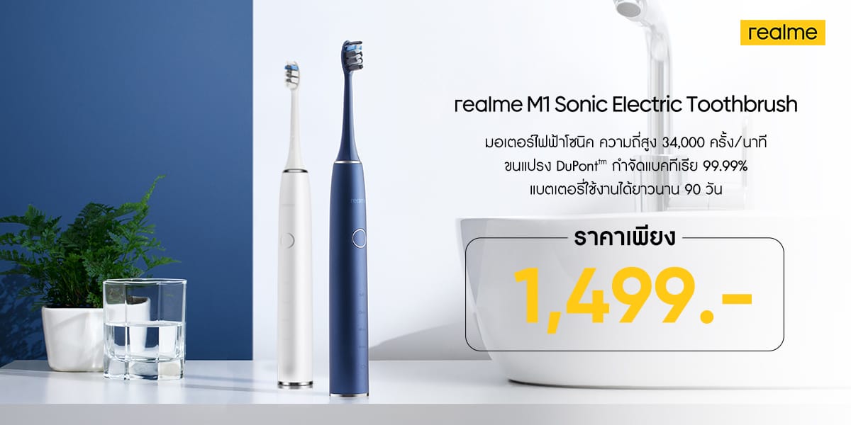 - realme M1 Sonic Electric Toothbrush แปรงสีฟันไฟฟ้าโซนิค ‘เพื่อช่องปากสะอาดล้ำลึก’ ที่มาพร้อมมอเตอร์ไฟฟ้าโซนิค ความถี่สูง 34,000 ครั้ง/ นาที พร้อมขนแปรง Dupont ช่วยกำจัดแบคทีเรีย 99.99% และแบตเตอรี่ใช้งานได้ยาวนาน 90 วัน ราคาเพียง 1,499 บาท