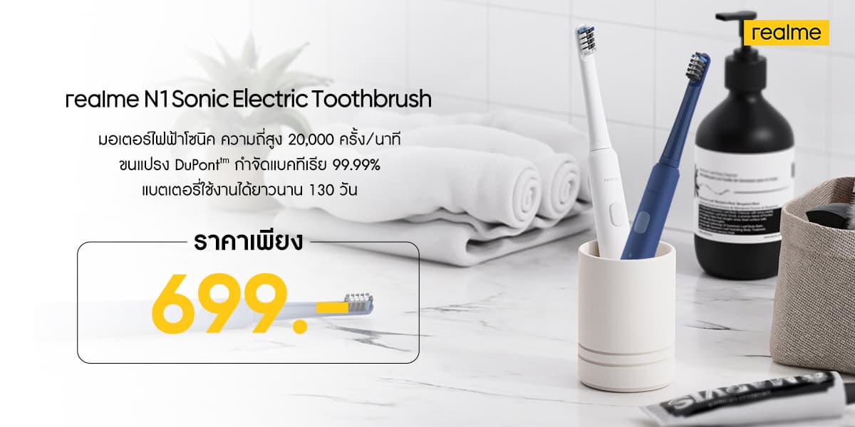 - realme N1 Sonic Electric Toothbrush แปรงสีฟันไฟฟ้าโซนิค ‘ดูแลช่องปาก สะอาดยิ่งขึ้น’ ที่มาพร้อมแบตเตอรี่ใช้งานได้ยาวนาน 130 วัน มอเตอร์ไฟฟ้าโซนิค ความถี่สูง 20,000 ครั้ง/นาที และขนแปรง Dupont ช่วยกำจัดแบคทีเรีย 99.99% ราคาเพียง 699 บาท