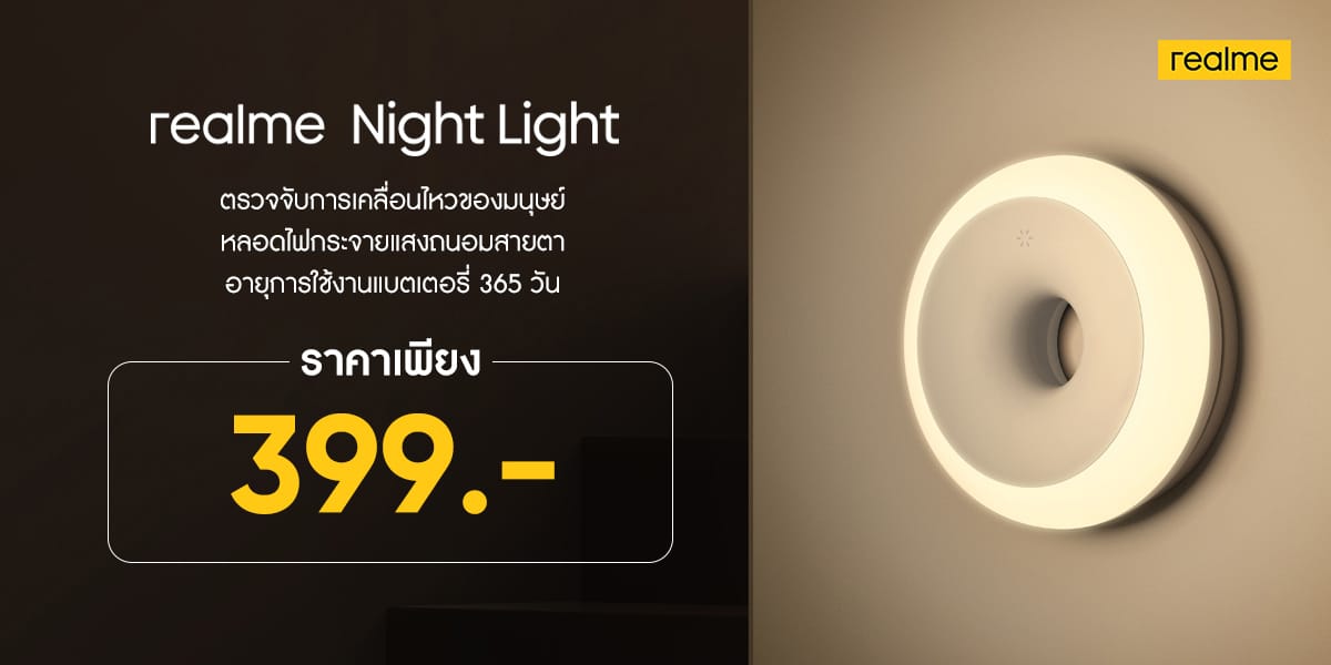 - realme Motion Activated Night Light ‘ให้ทุกค่ำคืนสว่างสดใส’ ที่มาพร้อม Human Motion Detection หรือระบบการตรวจจับการเคลื่อนไหวของมนุษย์ แสงนุ่มนวลในอุณหภูมิ 2800 เคลวิน ปกป้องดวงตาด้วยแสงสว่างใกล้เคียงกับแสงธรรมชาติที่สุด และแบตเตอรี่ยาวนาน 365 วัน ราคาเพียง 399 บาท