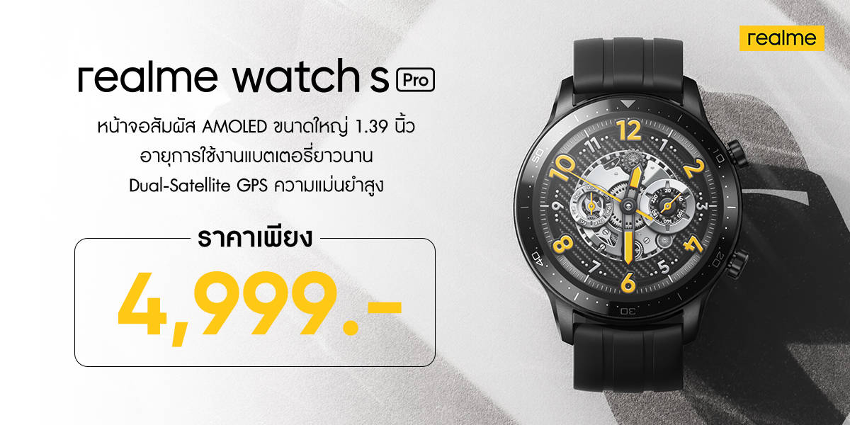 - realme Watch S Pro สมาร์ทวอทช์อัจฉริยะ ‘มือโปรอย่างมีสไตล์’ ที่มาพร้อมหน้าจอสัมผัส AMOLED ขนาดใหญ่ 1.39 นิ้ว อายุการใข้งานแบตเตอรี่ยาวนาน 14 วัน และ Dual-Satellite GPS ความแม่นยำสูง และโหมดใหม่ล่าสุดอย่างโหมดว่ายน้ำ มาในราคาเพียง 4,999 บาท
