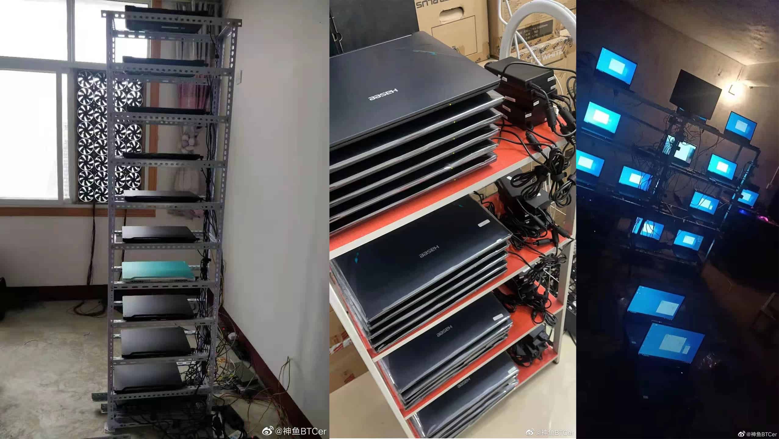 รูปจากทวิตเตอร์ @I_Leak_VN เผยให้เห็นแล็ปท็อปจำนวนมากที่ติดตั้งในชั้นวางเพื่อทำเหมืองขุดเงินคริปโต โดยแล็ปท็อปดังกล่าวน่าจะใช้เป็นรุ่นที่มาพร้อมการ์ดจอ RTX 3070 และ RTX 3060 อยู่ภายใน