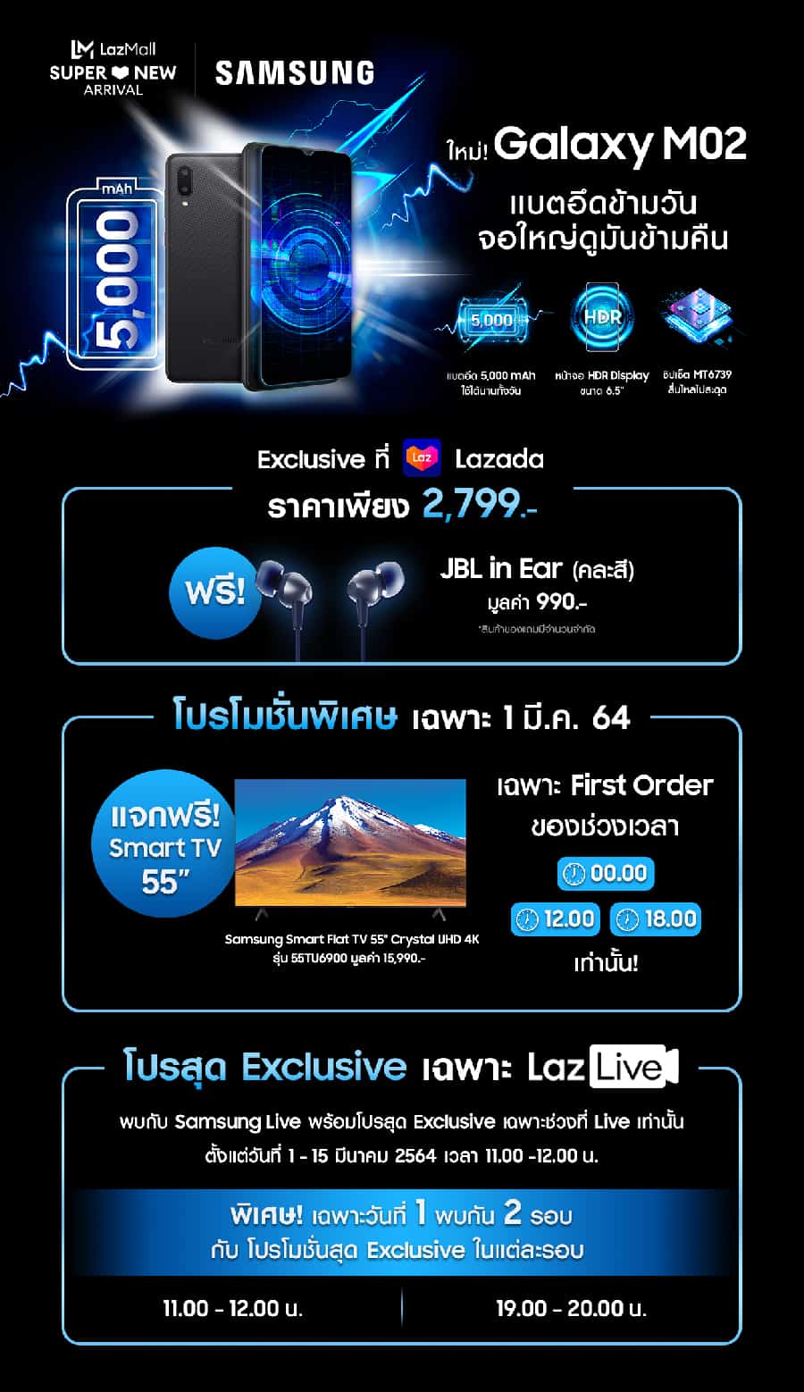 ในวันที่ 1 มี.ค. ซึ่งเป็นวันวางจำหน่ายวันแรก ซัมซุงได้เตรียมเซอร์ไพรส์เด็ดสำหรับคนที่สั่งซื้อ Samsung Galaxy M02 เป็นคนแรกในช่วง Flash Sale เวลา 00.00, 12.00 และ 18.00 ด้วยการมอบทีวี Samsung Smart Flat TV 55” Crystal UHD 4K มูลค่า 15,990 บาท ให้ไปทันที รวมถึงทุกการสั่งซื้อระหว่างวันที่ 1-31 มี.ค. 64 ยังจะได้หูฟัง JBL In Ear มูลค่า 990 บาท ไปใช้พร้อมกันอีกด้วย