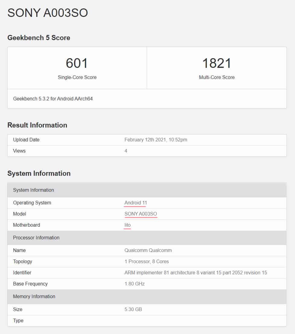 ข้อมูลใน Geekbench เผยให้เห็นว่าเจ้าสมาร์ทโฟนลึกลับ Sony A003SO มาพร้อมกับ RAM 6GB และระบบปฏิบัติการ Android 11 ใช้ชิป Qualcomm รหัส “lito” ความถี่พื้นฐาน 1.80GHz ได้คะแนน single-core 601 คะแนนและ multi-core 1,821 คะแนน