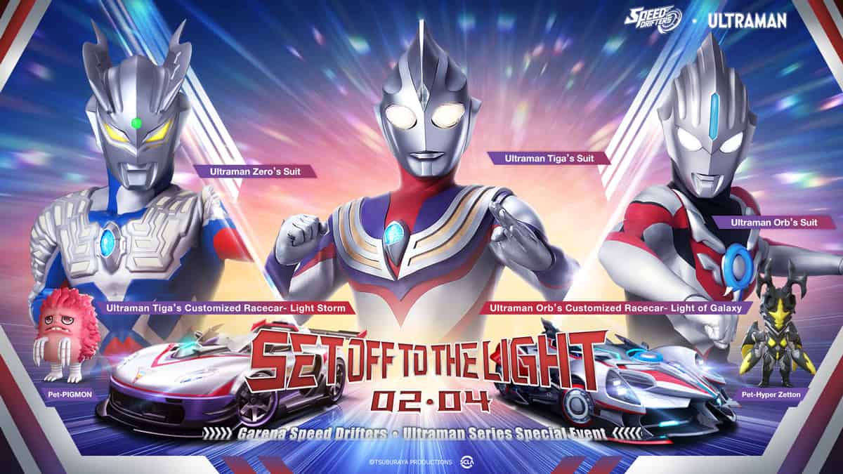 Ultraman กำลังเดินทางมายังโลก พร้อมกิจกรรมสุดพิเศษ กับรถแข่งที่ไม่ธรรมดา และคอสตูมที่มีแอกชันสุดเซอร์ไพรส์ การเชื่อมโยงแห่งโลกแฟนตาซีระหว่าง <Garena Speed Drifters> และ Ultraman ในครั้งนี้ได้มี Ultraman ได้มาเยือนโลก Speed Drifters ถึง 3 คนด้วยกัน ได้แก่ Ultraman Orb, Ultraman Tiga และ Ultraman Zeroเพื่อเป็นการฉลองการมาถึงของ Ultraman ทั้งสามคน ตั้งแต่วันที่ 4 กุมภาพันธ์เป็นต้นไป นักแข่งของเราจะได้รับรางวัลมากมายจากภารกิจพิชิตความเร็ว ไม่ว่าจะเป็นรถแข่งจาก Ultraman Tiga – B – Light storm, คอสตูม Super GUTS , สัตว์เลี้ยง-PIGMON และรางวัลอื่นๆ