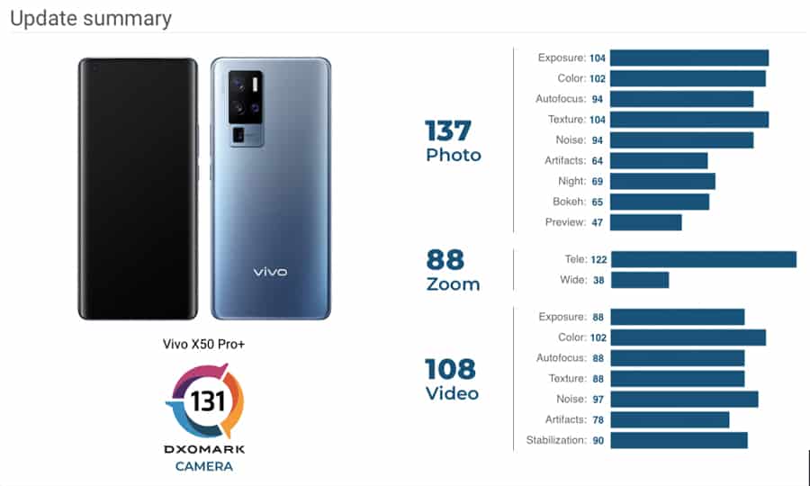 ย้อนกลับไปเมื่อเดือนตุลาคม 2020 เว็บไซต์ DxOMark ได้โพสต์รีวิวการให้คะแนนกล้องของสมาร์ทโฟน Vivo X50 Pro+ 127 คะแนนและมีการยกย่องในเรื่องประสิทธิภาพของกล้อง แต่ล่าสุด DxOMark มีการอัปเดตคะแนนให้สมาร์ทโฟนรุ่นเรือธงปี 2020 ของ Vivo ขึ้นเป็น 131 คะแนน
