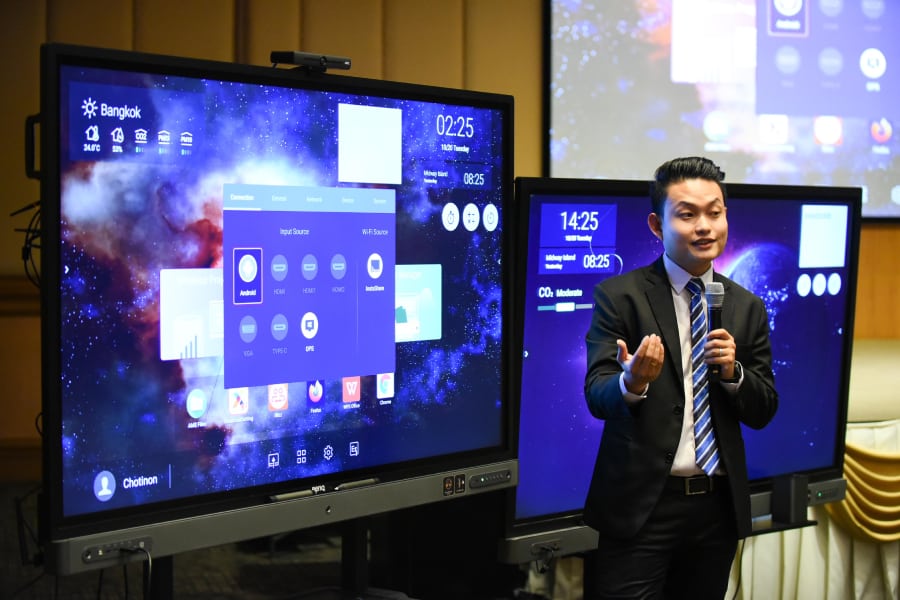 หรือคอมพิวเตอร์ ที่ใช้ในการเรียน ส่วนทางครูผู้สอนจะทำการสอนผ่านจอภาพ IFP ของเบ็นคิว ในห้องเรียนพร้อมกับนักเรียนอีกครึ่งหนึ่งของห้อง จอ IFP ของ เบ็นคิว ยังสามารถต่อเข้ากับไมโครโฟนและกล้องเพื่อทำเรียนหรือประชุมทางไกลแบบ Video Conference ได้ด้วยการเชื่อมต่อผ่าน Cloud Whiteboard ที่ช่วยเพิ่มประสิทธิภาพในการโต้ตอบระหว่างนักเรียนและคุณครู ซึ่งจะทำผ่านโปรแกรม Zoom หรือ Google Meet ก็ได้เช่นกันโดยที่ไม่ต้องใช้วงแลนหรืออินเตอร์เน็ตตัวเดียวกัน ซึ่งนั่นหมายความว่าเด็กที่เรียนที่บ้านและที่โรงเรียนสามารถเรียนรู้ไปพร้อมๆ กันได้แบบไร้รอยต่อ ” นายโชตินนท์ กล่าวปิดท้าย