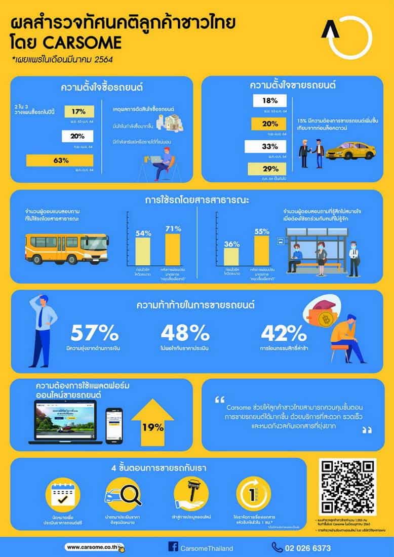 คาร์ซัม แพลตฟอร์มซื้อ-ขายรถยนต์มือสองออนไลน์ที่ใหญ่ที่สุดในเอเชียตะวันออกเฉียงใต้ นอกจากนี้ 7 ใน 10 ของคนที่จะขายรถยนต์วางแผนจะขายในช่วงเวลาเดียวกัน ข้อมูลดังกล่าวเป็นการสร้างความคึกคักให้กับตลาด รถยนต์ มือสองในประเทศไทย ได้ทำการสำรวจทัศนคติผู้บริโภคชาวไทยจำนวน 1,055 คน ในเดือนตุลาคม 2563 ที่ผ่านมา