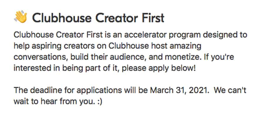 ในระหว่าง Clubhouse town hall รายสัปดาห์เมื่อวันอาทิตย์ที่ผ่านมา Paul Davison ซีอีโอได้ประกาศเรื่องโปรแกรมครีเอเตอร์ของแอปแชทเสียงยอดนิยมเป็นครั้งแรก โดย Clubhouse Creator First จะช่วยโฮสต์และครีเอเตอร์สร้างฐานผู้ฟัง , เชื่อมต่อกับแบรนด์ต่างๆ และที่สำคัญที่สุดคือสร้างรายได้จากโชว์ของพวกเขาบนแพลตฟอร์ม