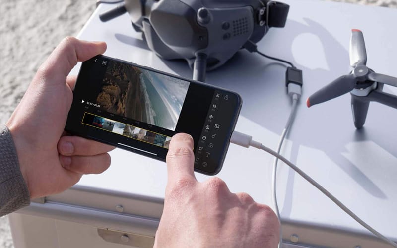 ที่น่าสนใจคือ โดรน FPV มาพร้อมชุดแว่นตาสำหรับผู้บังคับโดรนได้เห็นมุมมอง front-line view และสิ่งที่อยู่ข้างหน้าโดรน โดยชุดแว่นตา DJI FPV Goggles V2 ใช้ระบบ O3 transmission system ตัวใหม่ ด้วยแบนด์วิดท์ 50 Mbps ในระยะเกิน 6 ไมล์ สามารถตัดสลับความถี่คู่แบบอัตโนมัติ และปรับปรุงให้ลดเวลาการตอบสนองให้สามารถตอบสนองได้เร็วขึ้น