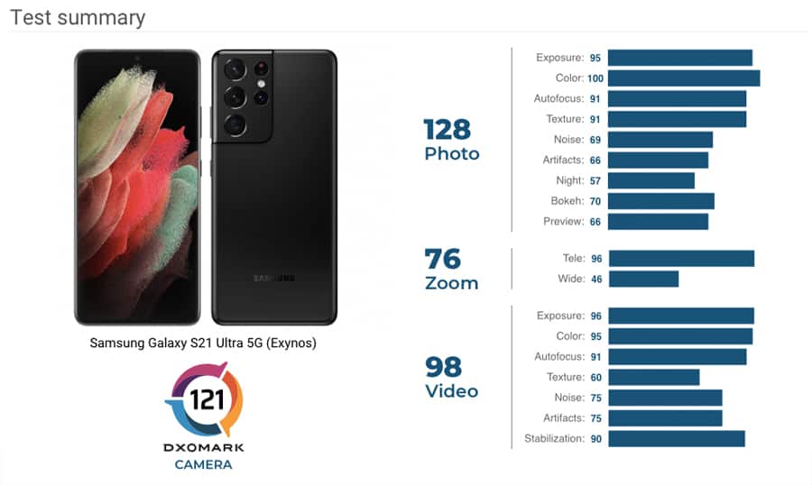 โดยได้คะแนนในส่วนของการถ่ายภาพนิ่งไปที่ 128 คะแนน คะแนนการซูม 76 คะแนน และคะแนนการถ่ายวิดีโอ 98 คะแนน ทำให้คะแนนรวมของ Samsung Galaxy S21 Ultra 5G – Exynos อยู่ที่ 121 คะแนน