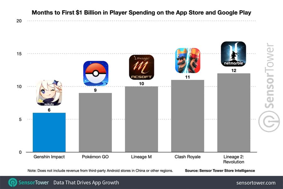 Store Intelligence ของ Sensor Tower เผยข้อมูลว่าเกม Genshin Impact เวอร์ชันมือถือที่พัฒนาโดย miHoYo มี รายได้ จากการใช้จ่ายของผู้เล่นทะลุ 1 พันล้านดอลลาร์ หลังจากเปิดตัวอย่างเป็นทางการไม่ถึง 6 เดือน