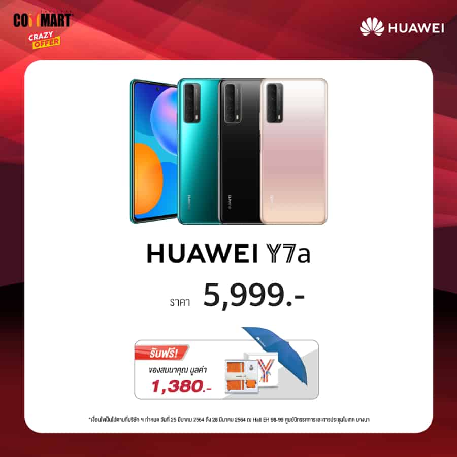 ฝั่งสมาร์ทโฟนก็ไม่น้อยหน้า ยกขบวนรุ่นเด็ดมาจัดโปรแบบจัดจ้านพร้อมมอบของสมนาคุณอีกเพียบ อย่าง HUAWEI nova 7 Series สมาร์ทโฟน 5G รุ่นกลางฟีเจอร์อัดแน่น ซึ่งมาในราคาย่อมเยาว์เริ่มต้นเพียง 7,990 บาท พร้อมของสมนาคุณเป็นหัวเว่ยกิ๊ฟท์บ๊อกซ์ ส่วน HUAWEI Y7a สมาร์ทโฟนรุ่นเล็กสเปกอัดแน่น กล้องหลัง 4 ตัว ความละเอียดสูงสุด 48 ล้านพิกเซล ในราคาเบาๆ เพียง 5,999 บาท รับไปเลยหัวเว่ยกิ๊ฟท์บ๊อกซ์และร่ม
