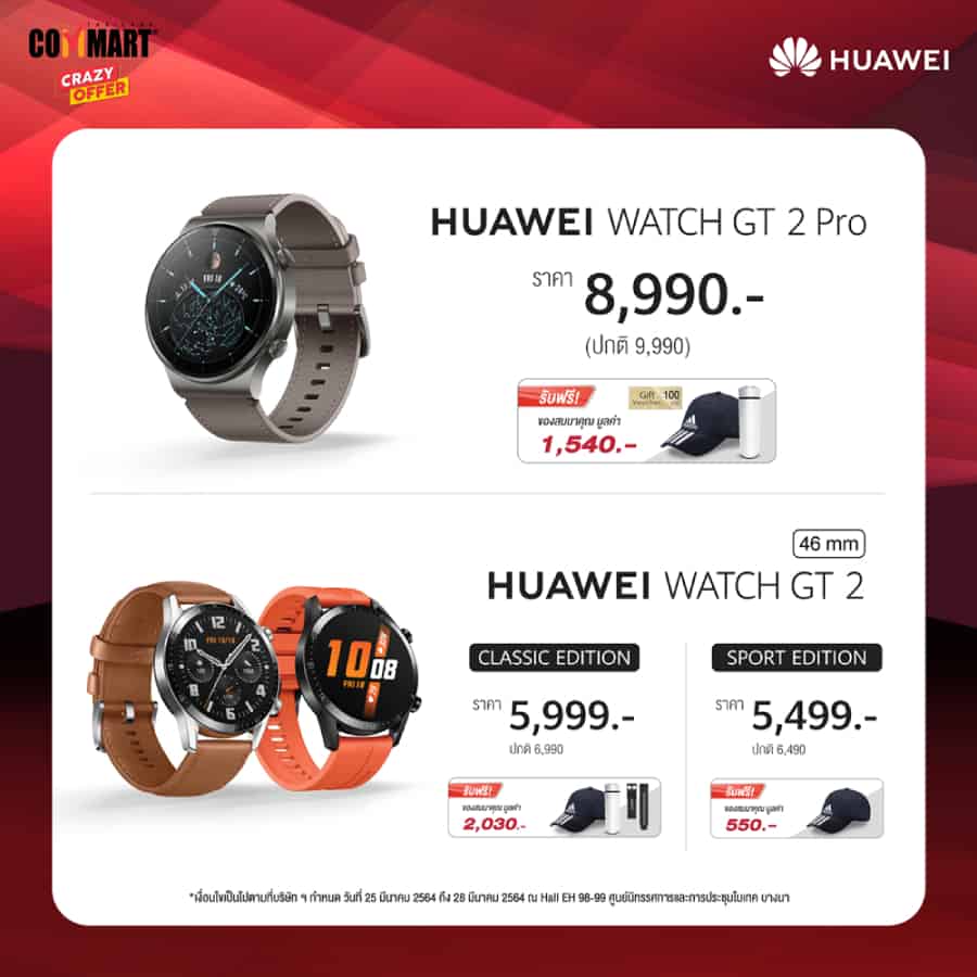 และสามารถติดตามผลออกกำลังกายได้มากกว่า 100 โหมด พร้อมให้จับจองได้ในราคา 8,990 บาท จากปกติ 9,990 บาท รับไปเลยแบบจุกๆ กับของสมนาคุณเป็นบัตรกำนัลมูลค่า 100 บาท หมวก Adidas และกระบอกน้ำเก็บอุณหภูมิ มูลค่ารวม 1,540 บาท ส่วน HUAWEI Watch GT 2 มาในราคาเริ่มต้น 5,499 บาท พร้อมของสมนาคุณสุดพรีเมียมเป็นหมวก Adidas สายนาฬิกา และกระบอกน้ำเก็บอุณหภูมิ