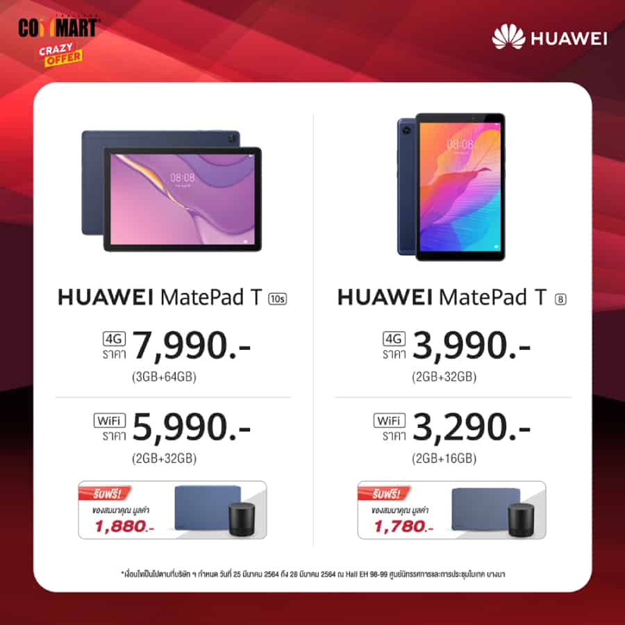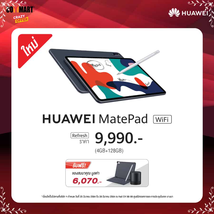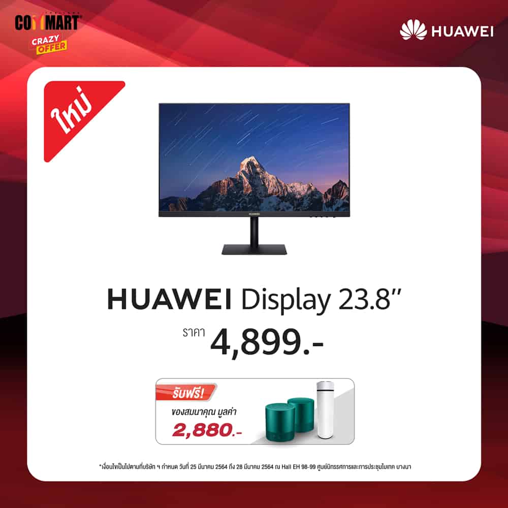 กลับมาอีกครั้งกับงานคอมมาร์ท มหกรรมแสดงสินค้าไอทีและนวัตกรรมทางเทคโนโลยี ซึ่งครั้งนี้จัดขึ้นระหว่างวันที่ 25-28 มีนาคม 2564 ซึ่งทางหัวเว่ย คอนซูมเมอร์ บิสสิเนส กรุ๊ป (ประเทศไทย) ไม่พลาดที่จะยกขบวนสินค้าและแก็ดเจ็ตไอทีหลากหลายประเภทพร้อมโปรโมชันแบบจัดเต็มเข้าร่วมชิงความเป็นหนึ่งภายในงาน นำทัพโดยแล็ปท็อปตัวเทพอย่าง HUAWEI MateBook 14, HUAWEI MateBook D 14, และ HUAWEI MateBook D 15, HUAWEI Display 23.8” จอมอนิเตอร์ถนอมสายตาตัวแรกของหัวเว่ยที่เพิ่งเปิดตัวไปสดๆ ร้อนๆ และ HUAWEI MatePad แท็บเล็ตชิปเซ็ตอัปเกรดใหม่พร้อมรองรับเทคโนโลยีสุดล้ำ WiFi 6 ยกขบวนมาให้ได้จับจองในราคาเกินคุ้ม พร้อมของสมนาคุณสุดพิเศษที่จัดให้แบบจุใจรวมมูลค่าสูงสุดกว่า 20,000 บาท
