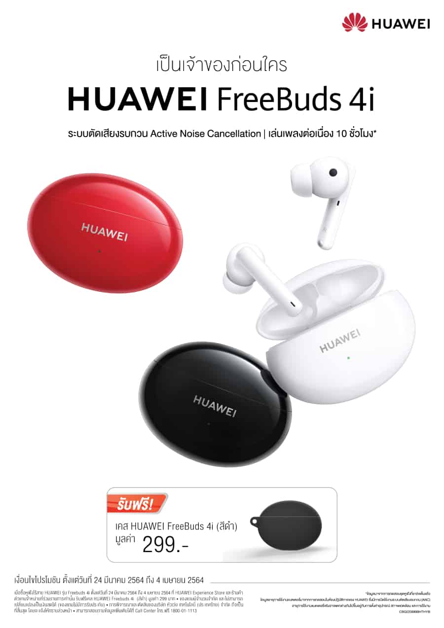 HUAWEI FreeBuds 4i มีให้เลือกทั้งหมด 3 สี ได้แก่ Ceramic White, Carbon Black และ Red Edition มาในราคาสุดคุ้มที่ คุณเองก็เป็นเจ้าของได้ง่ายๆ เพียง 2,799 บาท พิเศษสุดๆ สำหรับผู้ที่ซื้อ HUAWEI FreeBuds 4i ก่อนใคร ตั้งแต่วันที่ 24 มีนาคม – 4 เมษายน 2564 รับทันที HUAWEI FreeBuds 4i CASE สีดำ มูลค่า 299 บาท เมื่อซื้อสินค้าที่หน้าร้าน HUAWEI Experience Store และร้านค้าตัวแทนจำหน่ายที่ร่วมรายการ รวมถึงช่องทางออนไลน์อย่าง HUAWEI Online Store, Shopee, Lazada และ JD Central ท่านใดสนใจสามารถอ่านรายละเอียดเกี่ยวกับผลิตภัณฑ์เพิ่มเติมได้ที่นี่