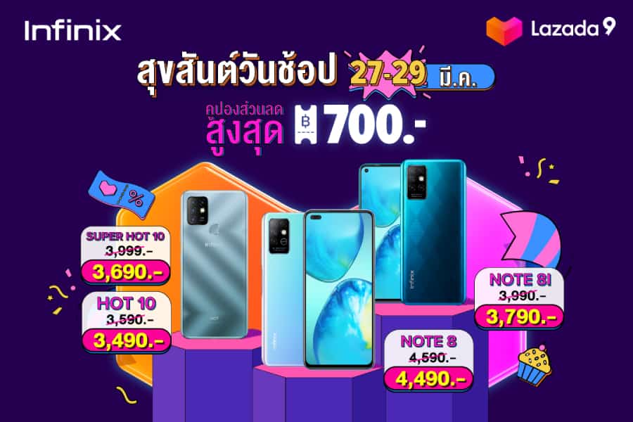 Infinix แบรนด์สมาร์ตโฟนระดับโลกร่วมมือกับ Lazada จัดแคมเปญต้อนรับเทศกาล ‘Lazada Birth Day Sale’ มอบส่วนลด Flash sale ทุกช่วงเวลา พร้อมรับคูปองส่วนลดสูงสุด 700 บาท เฉพาะวันที่ 27 – 29 มีนาคมนี้ ฟรี! ค่าจัดส่งทุกรายการ