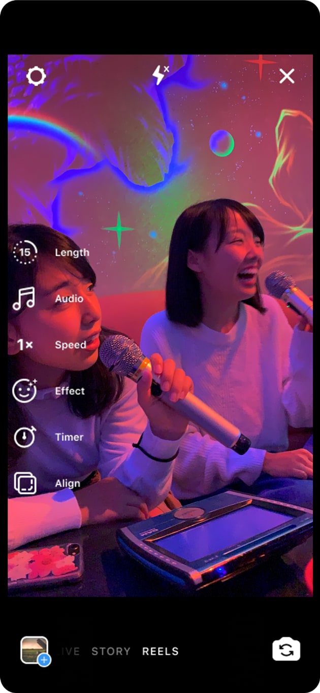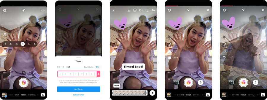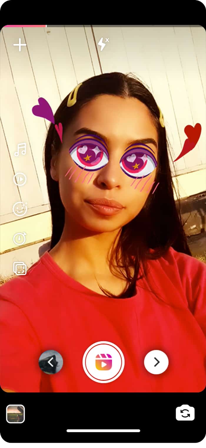 - เอ็ฟเฟ็กต์: ถ่ายคลิปด้วยเอ็ฟเฟ็กต์ Instagram ใดๆ ก็ได้ ซึ่งรวมถึงฟิลเตอร์ AR โดยสามารถถ่ายคลิปหลายๆ คลิปด้วยเอ็ฟเฟ็กต์ที่แตกต่างกัน และสามารถใช้เอ็ฟเฟ็กต์ที่สร้างสรรค์ขึ้นมาโดยผู้ใช้งานคนอื่นทั่วโลกได้