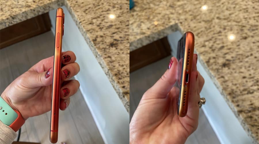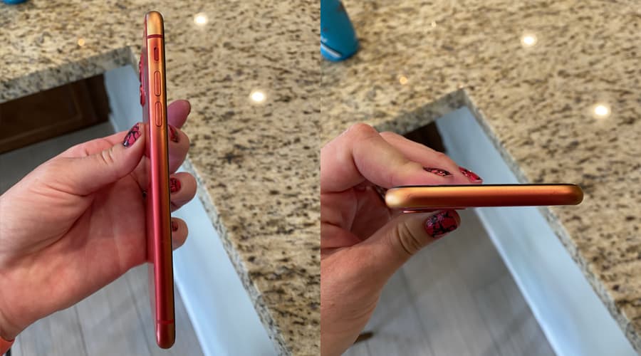 จุดที่สังเกตเห็นคือบริเวณด้านข้างของ iPhone 12 ใกล้ปุ่มเปิด-ปิด สีจางลงกลายเป็นสีส้ม และสังเกตุเห็นได้ชัดเจนว่าสีแดงนั้นหลุดออก