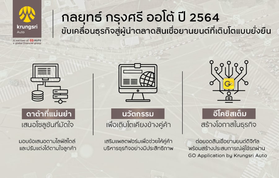 Krungsri Auto ผู้นำธุรกิจสินเชื่อยานยนต์ครบวงจร ประกาศกลยุทธ์การดำเนินธุรกิจ ปี 2564 ขับเคลื่อนธุรกิจสู่การเป็นผู้นำตลาดสินเชื่อยานยนต์อย่างยั่งยืน ผ่าน 3 แนวทาง ผสานดาต้าที่แม่นยำเพื่อเสนอโซลูชันมัดใจลูกค้า เสริมนวัตกรรมเพื่อการเติบโตของคู่ค้า และต่อยอดอีโคซิสเต็มเพื่อโอกาสในธุรกิจ