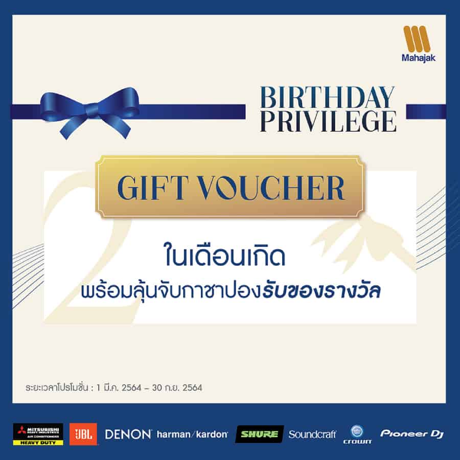 - BIRTHDAY PRIVILEGE: GIFT VOUCHER แทนเงินสด และเมื่อใช้ GIFT VOUCHER แล้วจะได้รับสิทธิ์ จับฉลากรับของรางวัลพิเศษ ณ จุดขาย 1 คน / 1 สิทธิ์