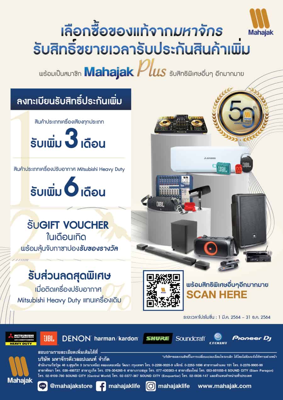 บริษัทมหาจักรดีเวลอปเมนท์ จำกัด ขอมอบสิทธิพิเศษให้กับลูกค้ามหาจักรฯ ทุกท่านเพียงซื้อสินค้าประเภทเครื่องเสียง หรือเครื่องปรับอากาศ และทำการลงทะเบียนรับประกันสินค้า ผ่าน Line: @mahajakplus และเว็บไซต์ http://warranty.mahajak.com/th/warranty/ท่านก็จะได้รับสิทธิ์เป็น สมาชิก MAHAJAK PLUS พร้อมรับสิทธิพิเศษ ทั้งส่วนลด GIFT VOUCHER และลุ้นรับของรางวัลมากมาย