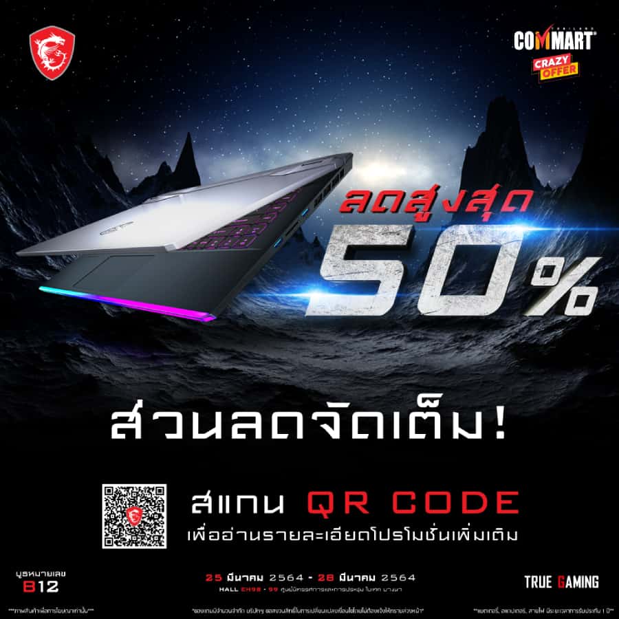 โปรโมชั่น งาน Commart Crazy Offer 2021 ทาง MSI ก็ได้ขนทีเด็ดไปจัดเต็มให้แฟนๆกันอย่างครบครัน ทั้งเกมมิ่งโน้ตบุ๊กตัวแรงรุ่นใหม่ หรือรุ่นที่เน้นในความบางสำหรับการทำงาน ส่วนลดสูงสุดถึง 50% มาเจอกันได้ที่บูธหมายเลข B12 Hall EH98 ไบเทค บางนา