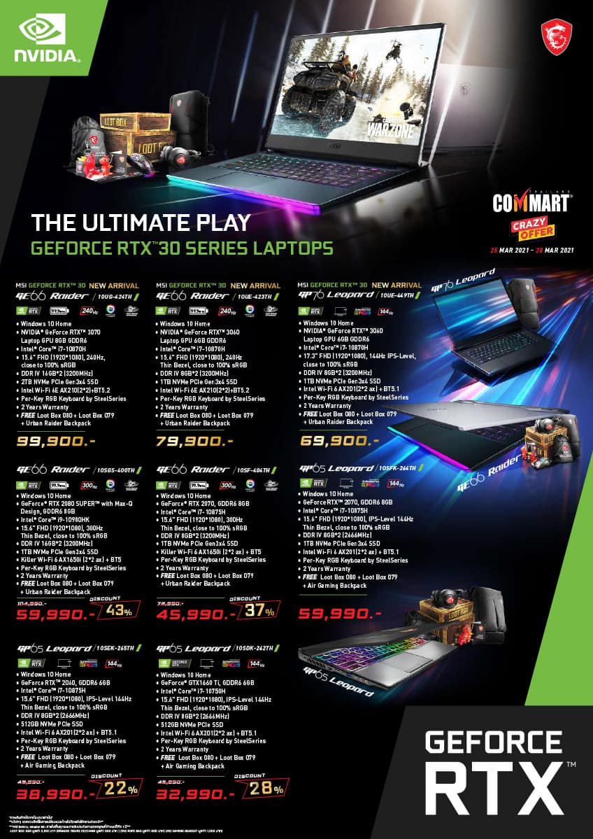 อีกทั้งยังมาพร้อมกองทัพเกมมิ่งโน้ตบุ๊กรุ่นใหม่ที่ใช้งานกราฟิกการ์ด RTX 30 Series ในราคาเริ่มต้นที่ 36,900 บาท ห้ามพลาดเด็ดขาดเพราะงานนี้ของมีจำนวนจำกัด!