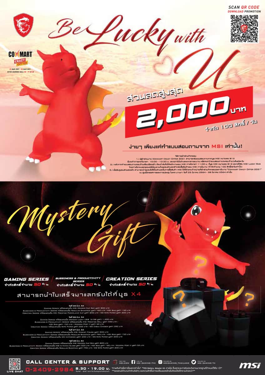 พิเศษสำหรับงานนี้เท่านั้น กิจกรรมใหม่จาก MSI ในชื่อ Be Lucky with U รับคูปองส่วนลดมูลค่าสูงสุดถึง 2,000 บาท จำกัด 100 สิทธิ์ต่อวันเท่านั้น กิจกรรมเริ่ม 10:00 นาฬิกาของทั้ง 4 วัน นอกจากนั้นยังมีของพรีเมี่ยมพิเศษอีกมากมายจากโปรโมชั่น Mystery Gift ของพรีเมี่ยมปริศนา ใครมาเร็วคนนั้นได้ไป ในจำนวนจำกัดต่อวัน อ่านรายละเอียดกิจกรรมเพิ่มเติมได้ที่: