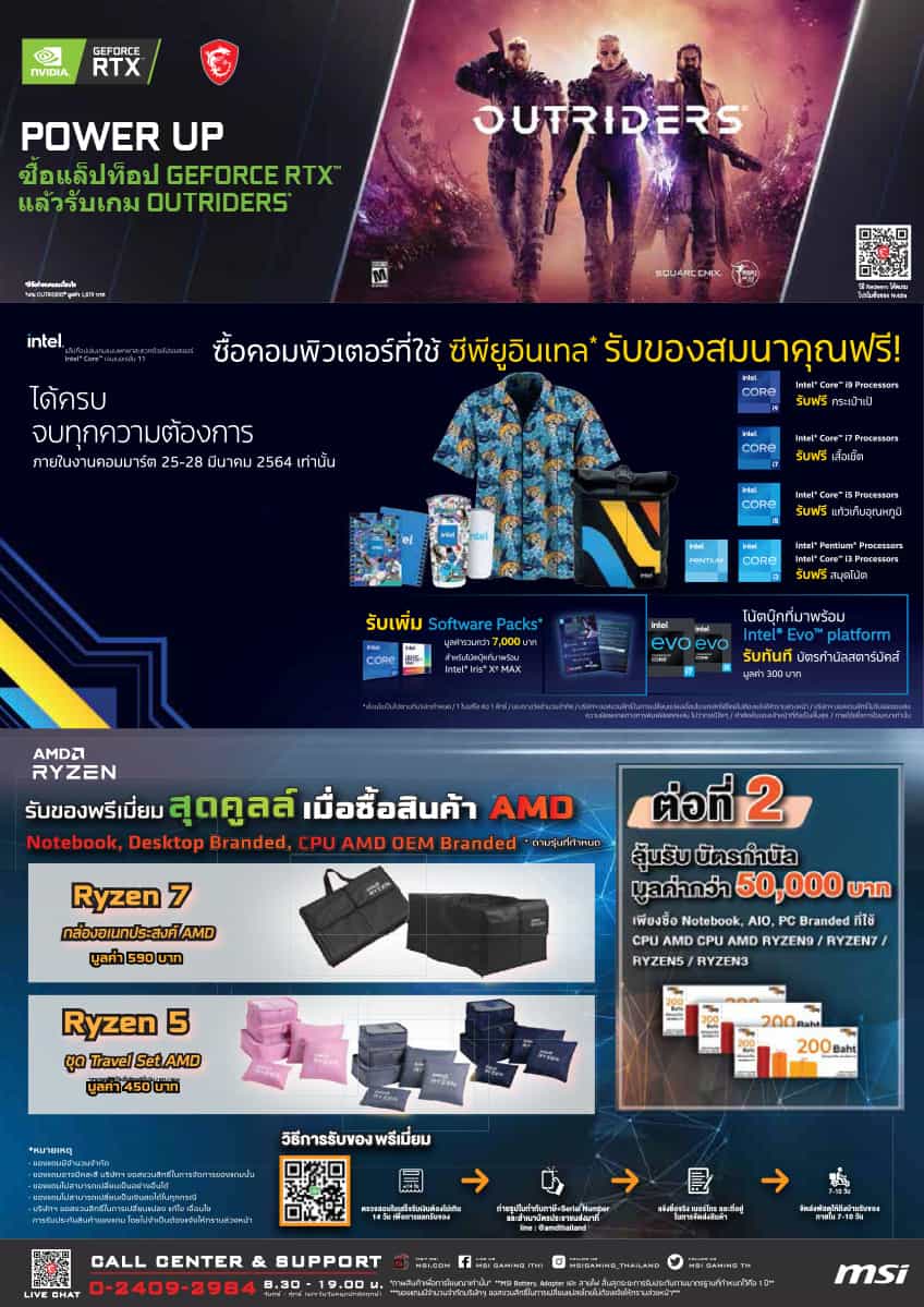 ดาวน์โหลดโบรชัวร์โปรโมชั่นสำหรับงานนี้ได้ที่: https://bit.ly/36OsWn8 หรือติดตามรายละเอียดโปรโมชั่นในงานเพิ่มเติมผ่านทาง MSI Gaming (TH) Facebook Fan Page https://msi.gm/2u6kGeX หรือโทรสอบถามได้ที่ MSI Call Center: 02-409-2984 (08:30 – 17:30) เวลาทำการ ตั้งแต่วันจันทร์ – ศุกร์ (ยกเว้นวันหยุดราชการ)