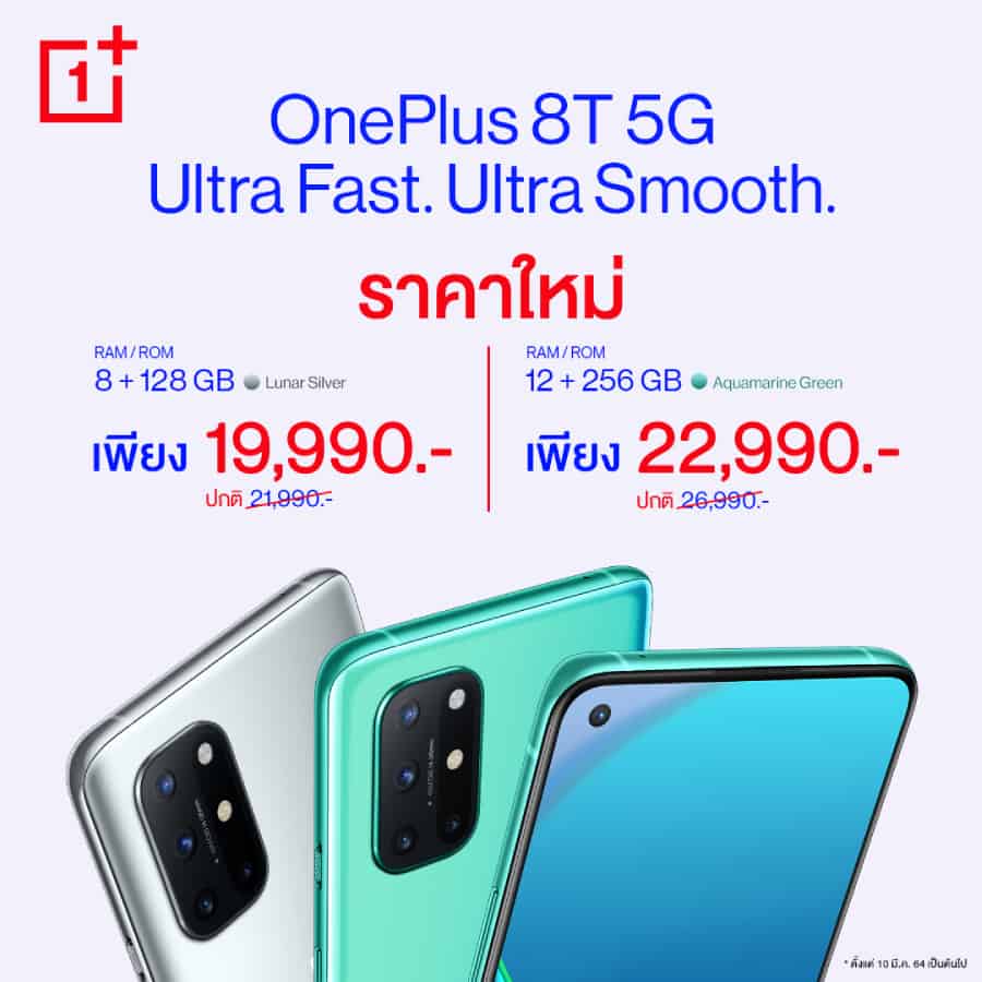 เซอร์ไพรส์ OnePlus 8T 5G ปรับลดราคาทุกรุ่น OnePlus 8T 5G รุ่น 8+128GB สี Lunar Silver จากราคา 21,990 บาท เหลือ 19,990 บาท OnePlus 8T 5G รุ่น 12G+256GB สี Aquamarine Green จากราคา 26,990 บาท เหลือ 22,990 บาท