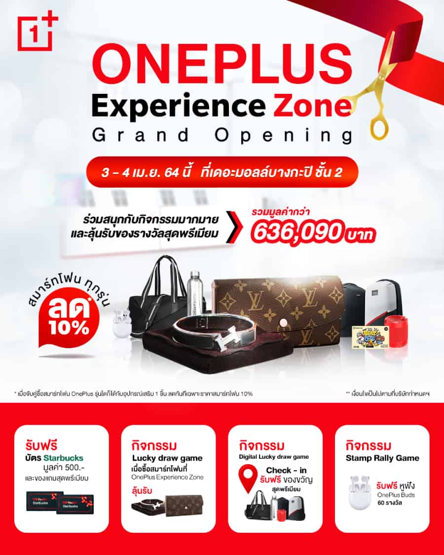 และเนื่องในโอกาสการเปิดตัว Grand Opening ทาง OnePlus จึงจัดกิจกรรมสุดพิเศษมากมาย ในวันที่ 3 – 4 เมษายน 2564 ซึ่งเป็นวันแรกของการเปิด OnePlus Experience Zone เปิดโอกาสให้ลูกค้าที่มาเข้าร่วมกิจกรรมต่างๆ เพื่อมอบประสบการณ์และข้อเสนอที่ดีที่สุดให้กับลูกค้า กับโปรโมชันสุดคุ้มและสมนาคุณพิเศษเฉพาะงานนี้จากทาง OnePlus ประเทศไทย สำหรับลูกค้าที่ต้องการซื้อผลิตภัณฑ์ OnePlus ในช่วง Grand Opening พร้อมกับกิจกรรมลุ้นรับของรางวัลอีกมากมายภายในงาน
