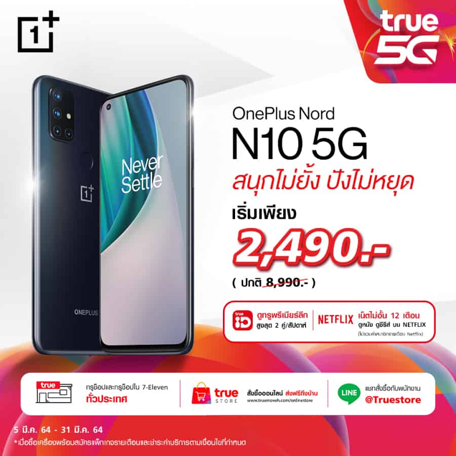 และ Truemove H (ทรูมูฟ เอช) เมื่อซื้อ OnePlus Nord N10 5G พร้อมแพ็กเกจรายเดือนเริ่มต้นที่ 699 บาทขึ้นไปได้ในราคาเริ่มต้นเพียง 2,490 บาท (ปกติ 8,990 บาท) ได้ตั้งแต่ 5 – 31 มีนาคม 2564 ที่ทรูช็อป และทรูช็อปใน 7-Eleven ทั่วประเทศ หรือทางเว็บไซต์ >>> https://bit.ly/3rskiUv