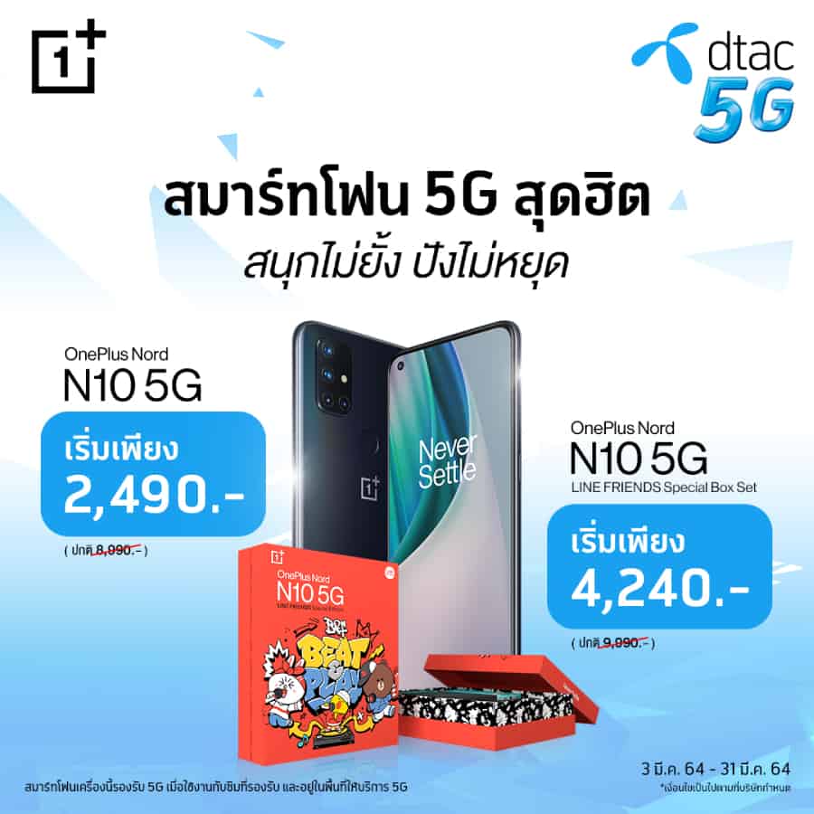ต่อด้วยข้อเสนอสุดพิเศษจาก Dtac (ดีแทค) เมื่อซื้อ OnePlus Nord N10 5G หรือ LINE FRIENDS Special Box Set ในราคาเริ่มต้นเพียง 2,490 บาท พร้อมแพ็กเกจรายเดือน 699 บาทขึ้นไป ที่ศูนย์บริการดีแทคที่ร่วมรายการ ตั้งแต่วันนี้ – 31 มีนาคม 2564