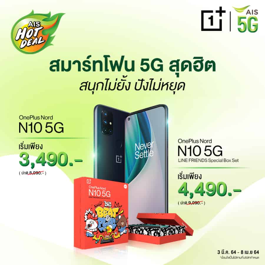 เริ่มกันที่ AIS (เอไอเอส) เมื่อซื้อ OnePlus Nord N10 5G หรือ LINE FRIENDS Special Box Set พร้อมแพ็กเกจรายเดือน 5G Hot Deal Max Speed เริ่มต้น 699 บาท (พร้อมชำระค่าบริการล่วงหน้า) ราคาเครื่องเริ่มต้นเหลือเพียง 3,490 บาท ตั้งแต่วันนี้ – 8 เมษายน 2564