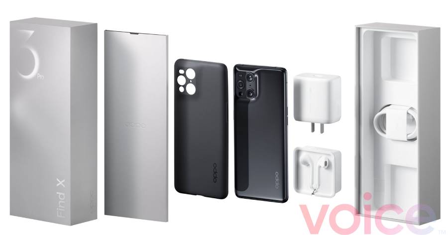 และยังมีภาพหลุดของแพ็กเกจกล่องของ Find X3 Pro ประกอบไปด้วย เคสป้องกัน ที่ชาร์จและหูฟังแบบมีสาย 1 คู่ ส่วนสายชาร์จคาดว่าจะเป็น USB-C ตามปกติ