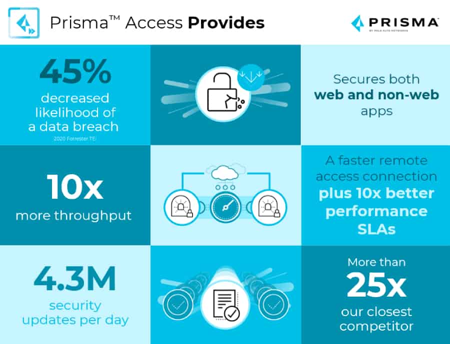 Prisma Access 2.0 ได้ขยายวิสัยทัศน์และสร้างมาตรฐานความปลอดภัยบนคลาวด์ ที่เชื่อมต่อกับเครือข่าย จากทางไกลที่เร็วขึ้นมากกว่าโซลูชันส์อื่น 10 เท่า และอัพเดตข้อมูลความปลอดภัยมากกว่า 4.3 ล้านครั้ง ต่อวัน ซึ่งมากกว่าคู่แข่งประมาณ 25 เท่า สร้างความมั่นใจในความปลอดภัยจากทั้งผู้ใช้และข้อมูลขององค์กร