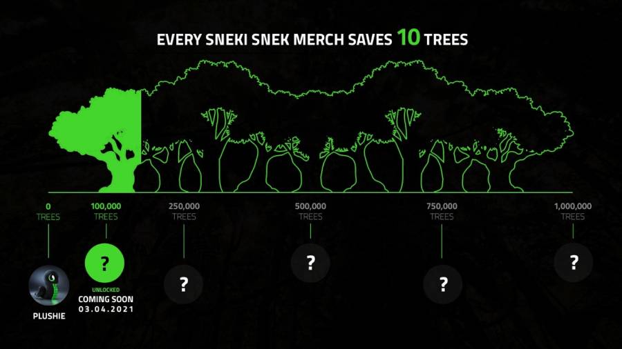 เป้าหมายใหม่ที่จะไปถึงคือ 250,000 500,000 750,000 และสุดท้ายที่ 1,000,000 ต้น ในขณะที่ชุมชนเกมเมอร์รวมตัวกันเพื่อบรรลุเป้าหมายเหล่านี้ Razer จะยังคงเปิดตัวสินค้า Sneki Snek ใหม่ในแต่ละขั้นตอน โดยให้รางวัลแก่ชุมชนสำหรับความพยายามของพวกเขาและสนับสนุนให้พวกเขาบรรลุเป้าหมายสุดท้ายที่ 1 ล้านต้น สินค้าของ Sneki Snek ทุกชิ้นที่ขายจะปกป้องต้นไม้ 10 ต้นและมีส่วนช่วยในการบรรลุเป้าหมายใหม่อันยิ่งใหญ่ที่มีต้นไม้ 1 ล้านต้น