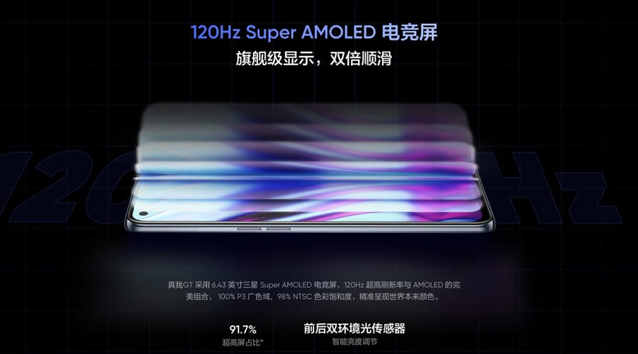 หน้าจอแสดงผล Super AMOLED E4 ขนาด 6.43 นิ้วแบบ punch-hole ความละเอียดหน้าจอ Full HD+ 1080 x 2400 พิกเซล refresh rate 120Hz 100% P3 color gamut อัตราส่วนหน้าจอต่อตัวเครื่องที่ 91.7%