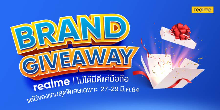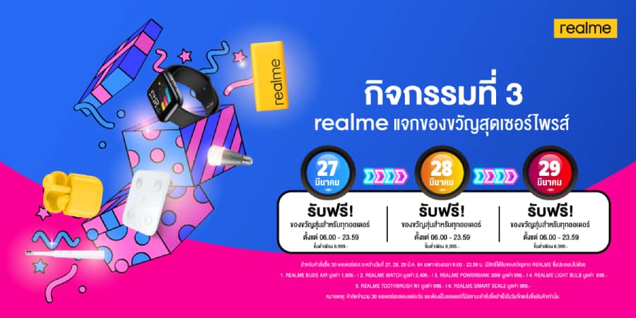 realme แจกของขวัญสุดเซอร์ไพร์ส สำหรับคำสั่งซื้อ 30 ออเดอร์แรก ระหว่างวันที่ 27, 28 และ 29 มีนาคม 2564 เฉพาะช่วงเวลา 06.00 – 23.59 น. มีสิทธิ์ได้รับของขวัญจาก realme ซึ่งประกอบไปด้วย