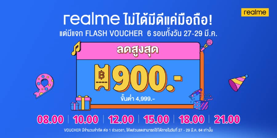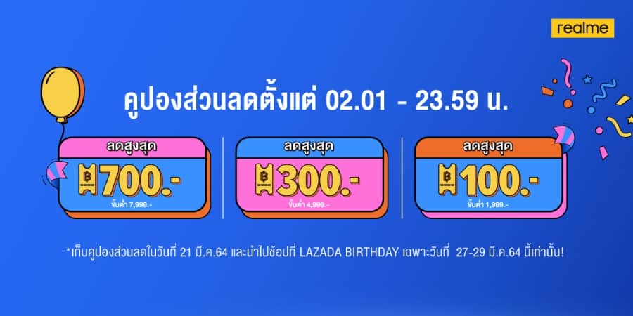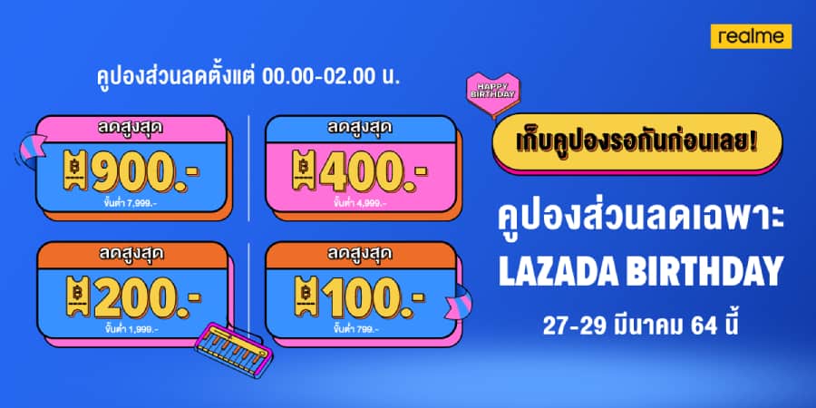 realme ร่วมฉลองวันสุดพิเศษกับแพลตฟอร์มยักษ์ใหญ่อย่าง Lazada ในแคมเปญ Lazada Birthday : Best Gift Ever มอบของขวัญที่ดีที่สุด โดยยกขบวนสมาร์ทโฟนและผลิตภัณฑ์ AIoT มาในราคาพิเศษพร้อมส่วนลดสูงสุด 35% โค้ดส่วนลดสูงสุด 900 และของแถมสุดพรีเมียม พิเศษเฉพาะวันที่ 27-29 มีนาคมนี้